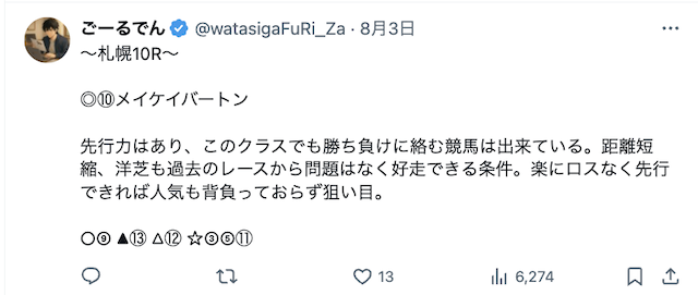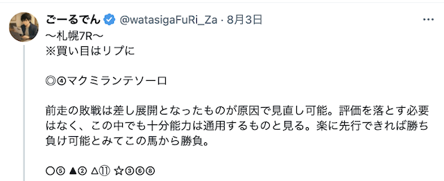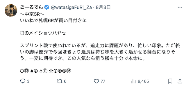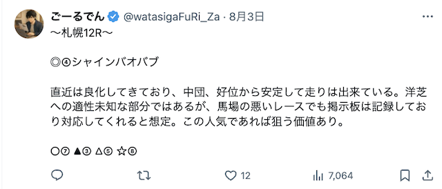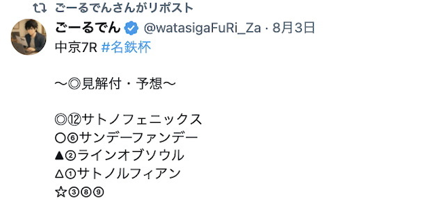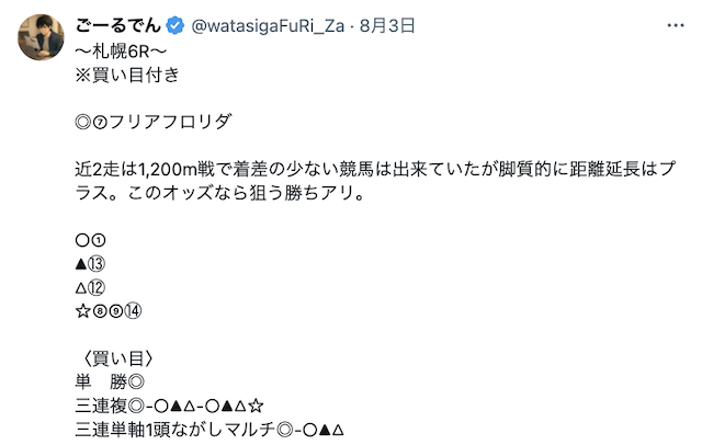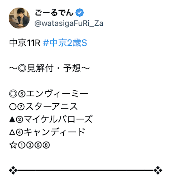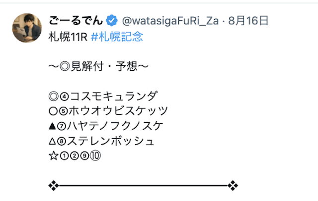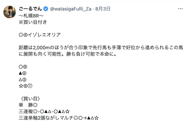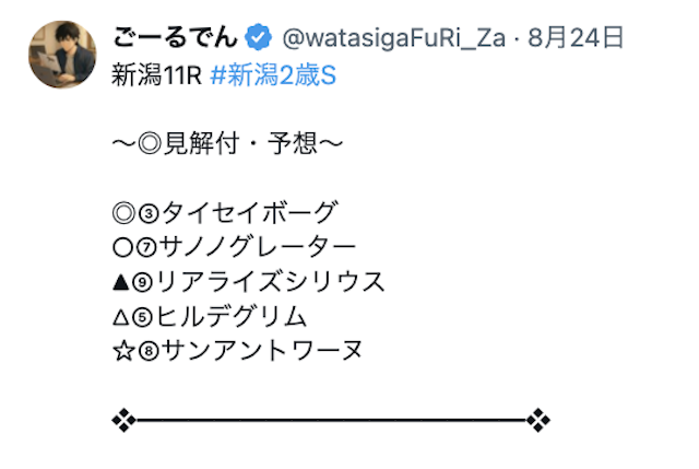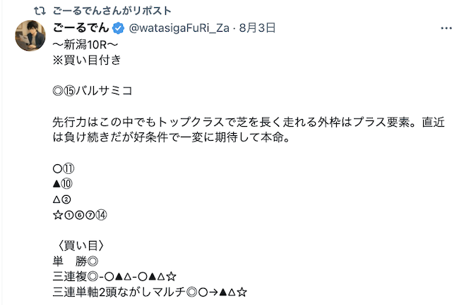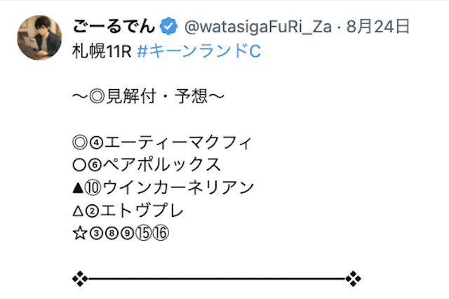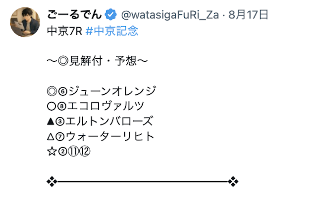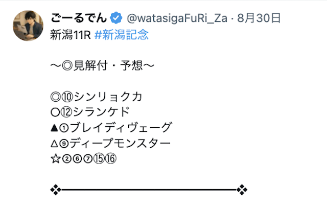 ごーるでんさんの予想は、人気に流されない独自の視点が魅力。展開やバイアスまで見た考察は他と一線を画していて、読み応えがあります。