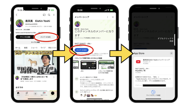 - 義英真のチャンネルページ「メンバーになる」をタップ
