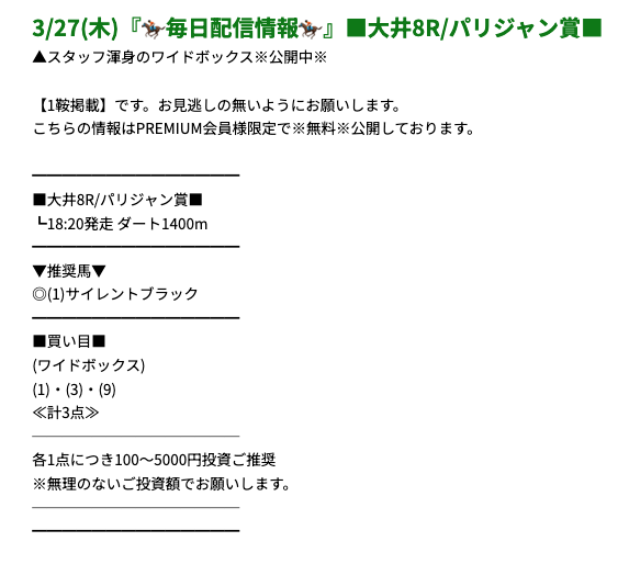 プレミアムはレース選びが上手く、人気馬を軸に穴馬を相手に選んだ無難な買い目を公開しています。