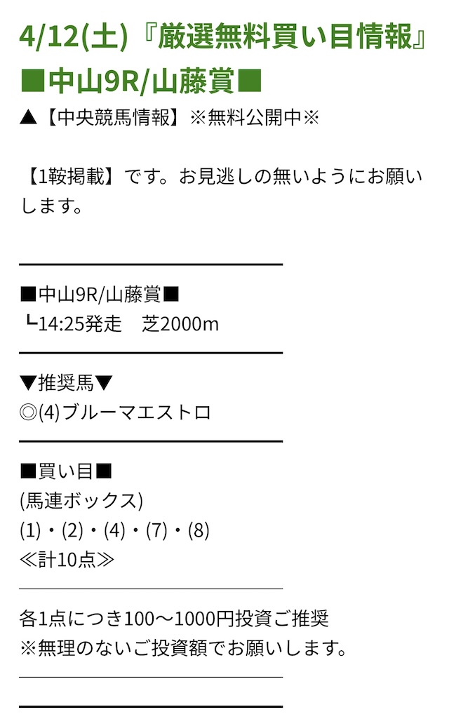 - サイトの推奨金額で馬券を購入(推奨金額がない場合は1点1000円で購入)