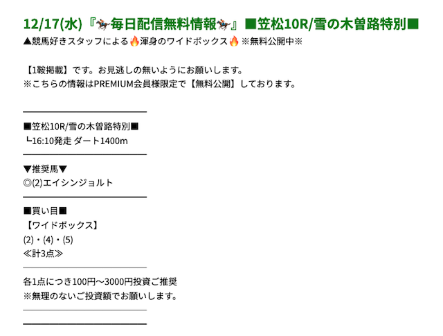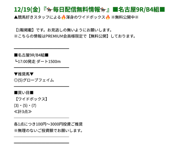 プレミアムはレース選びが上手く、人気馬を軸に穴馬を相手に選んだ無難な買い目を公開しています。