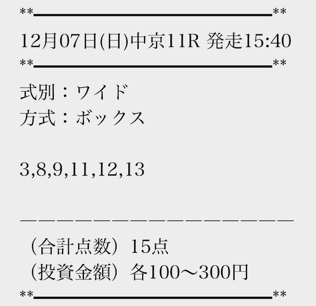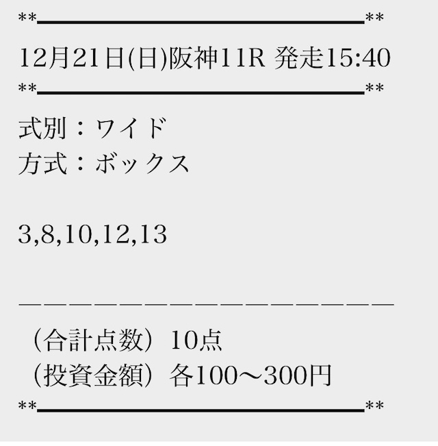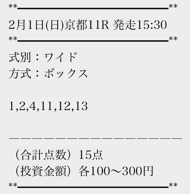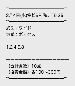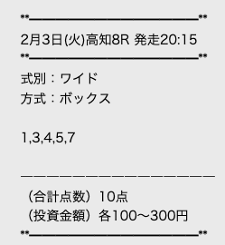 資金を抑えつつ的中を狙える。まさに最強とも言える「ワイドボックス」で利益をもたらせてくれます。また、ダブル的中・トリプル的中も多く回収率が非常に高いです。 |