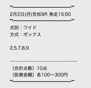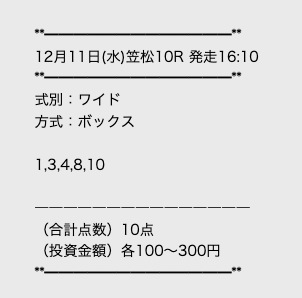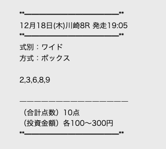| 裏週刊・馬場事情 | 248,000円 | 単日2鞍/3連単 (1鞍5,000円) |