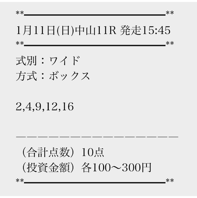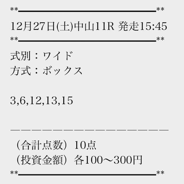 | サイレンスの遺言 | 750,000円 | 単日2鞍/3連単 (1鞍5,000円) |