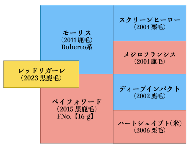 | 8 | 14 | レッドリガーレ | B | 血統的には特に大きな影響はなさそう。 馬体が足りないのでパワー必要な馬場はしんどいか。 |