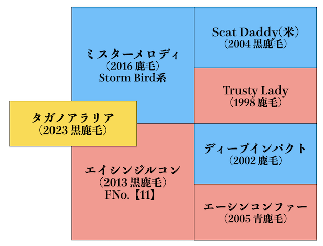 | 4 | 6 | タガノアラリア | B | 高速馬場で覚醒。 重馬場の成績悪く、雨が降ったら割引か。 |