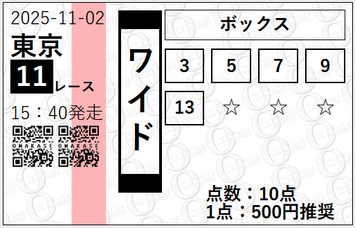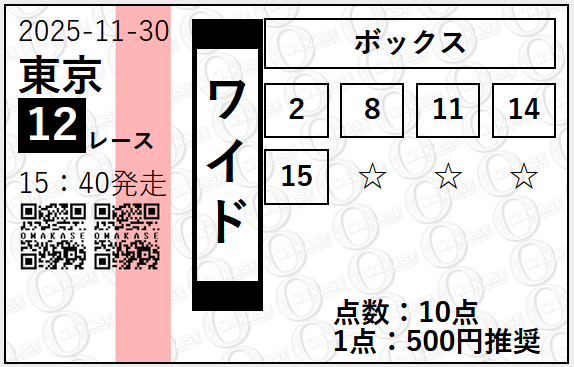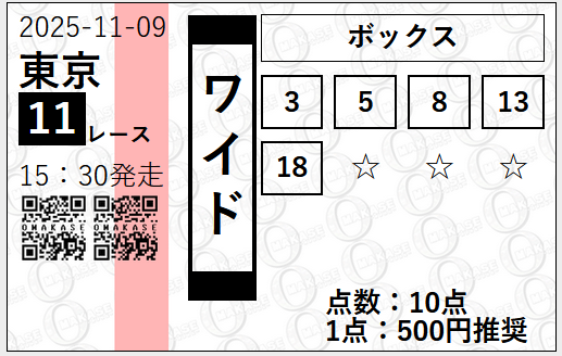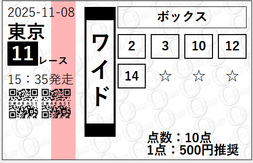 | 2025/11/30 | ジャパンC(G1) | ○ | 7,900円 |