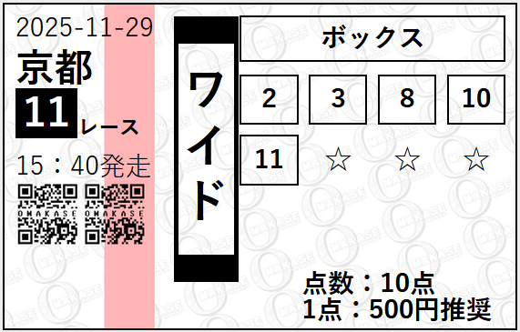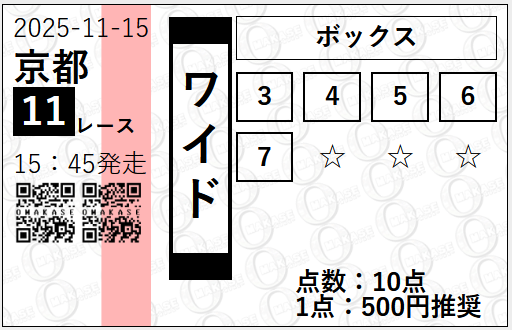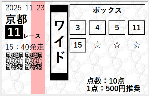 | 2025/11/29 | 京都2歳S(G3) | ○ | 70,550円 |