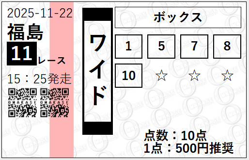 | 2025/11/22 | 福島記念(G3) | ○ | 12,100円 |