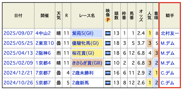 デビューから2戦は弟のC.デムーロ騎手が騎乗し、そこからは兄のM.デムーロ騎手が主戦として跨っていました。