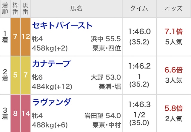 1着⑫セキトバイースト・2着⑦カナテープ・3着⑭ラヴァンダという結果に。