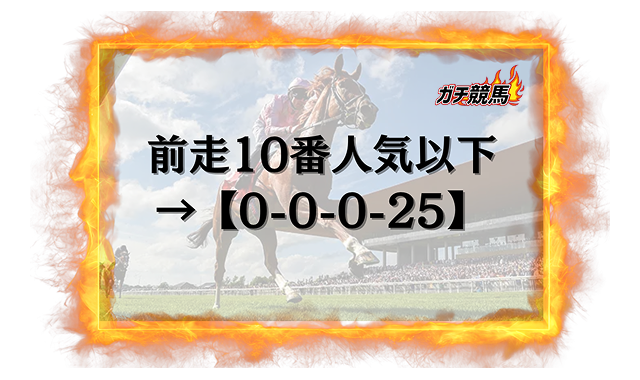 前走が階級問わず10番人気以下だった馬に関しては、過去10年で1度も馬券内に来ていません。