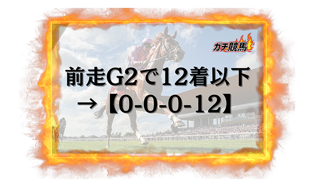 京阪杯では、前走G2で12着以下と大敗している馬の複勝率は0%です。