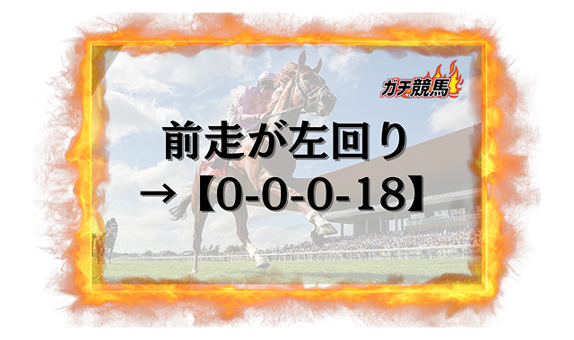 過去10年間で、前走が「左回りの東京・中京・新潟」のどこかで出走している馬は、1頭も馬券に絡んでいません。