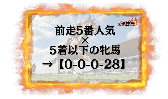 前走が「5番人気以下で5着以下だった牝馬」に絞ると、過去10年で複勝率0%。