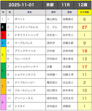 カチ指数1位のフェスティバルヒルが1着になり、指数ワースト5位以下はことごとく大敗。