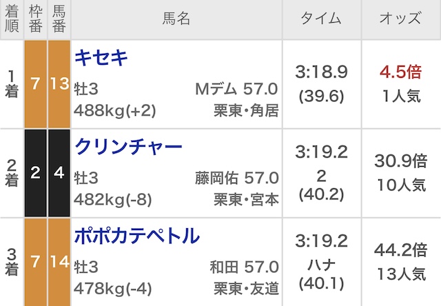 勝利したキセキは1番人気だったものの、2.3着には大穴が絡んでいます。