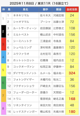 京都2歳Sでも、えーあいNEOの血統指数を見るだけで半分以上消去することができるので、見ておいて損はありません。