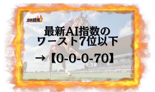 えーあいNEOが公開する「血統指数」というAI指数のワースト7位以下の馬は、直近10戦の重賞で【0-0-0-70】と1頭も馬券に絡んでいません。