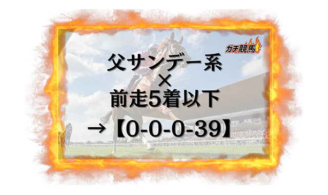 父サンデー系かつ、前走5着以下という条件に絞ると【0-0-0-39】というデータが出ています。