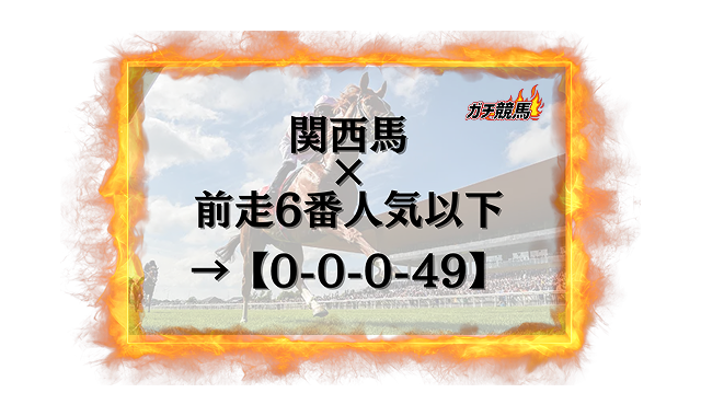 「関西馬かつ前走6番人気以下」という条件に当てはまる馬は、複勝率が0%となっています。