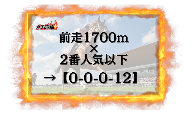 前走1,700mかつ、2番人気以下だった馬に絞ると、複勝率が0%です。