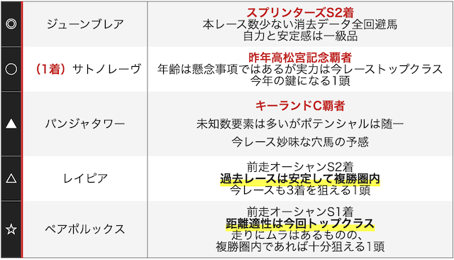 | ◯ | ダノンデサイル | 有馬記念3着 安定感は若干気になるが実力はTOPクラス 今レース本命と双璧をなす1頭 |