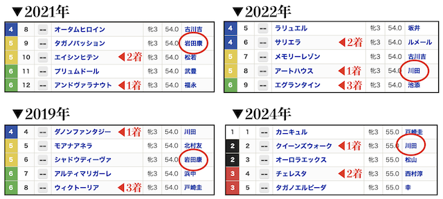 川田騎手は4回連続・岩田騎手は6回連続で継続しているので、ただの偶然とは思えません。