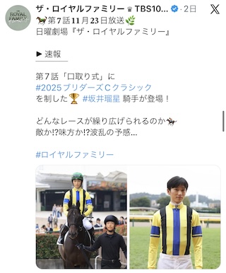 ザ・ロイヤルファミリーの公式から、第1話に武豊騎手が出演することが発表されました。
