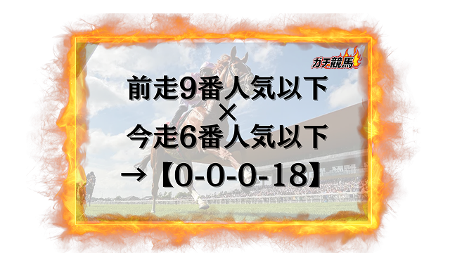 前走が9番人気以下かつ、今走6番人気以下の馬は複勝率が0%です。