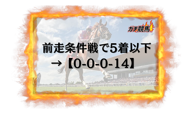前走が条件戦で5着以下と大敗している馬は【0-0-0-14】と複勝率0%。