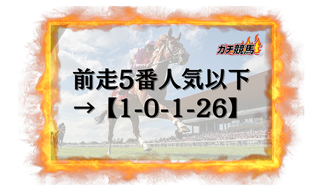 それ以外は全頭着外ですし、前走4着以下に絞ると1頭も馬券に絡んでいません。