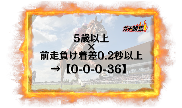 5歳以上かつ、前走0.2秒差以上付けられて大敗している馬は複勝率0%となっています。