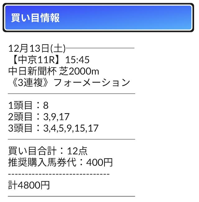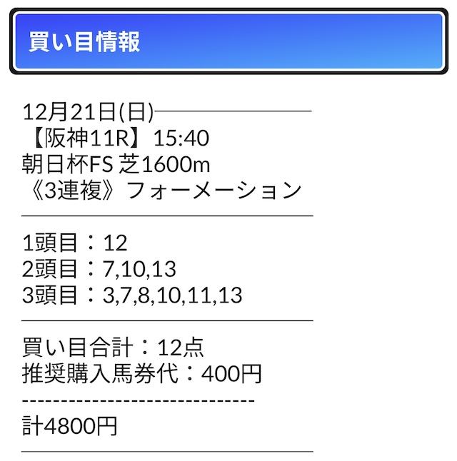 3連複なので当てるのは難しいと思いました。しかしリホラボを使用すると競馬ってこんなに簡単に当たるのかと思ってしまいます。でも他のサイトだとそんなに当たってないような。。