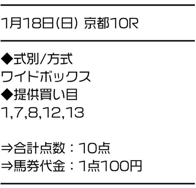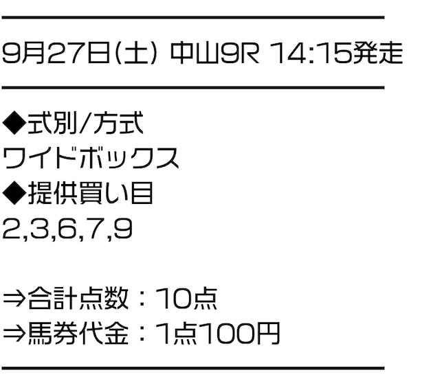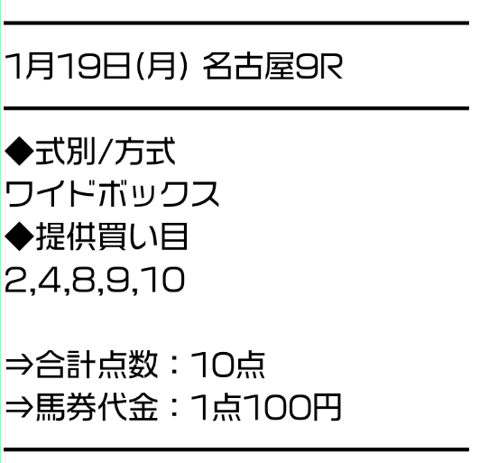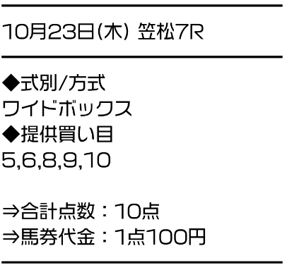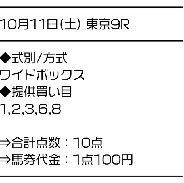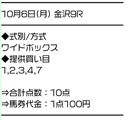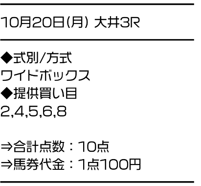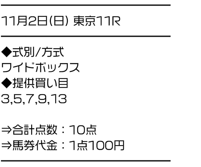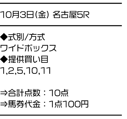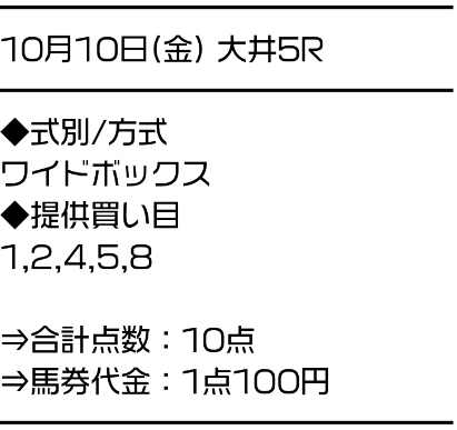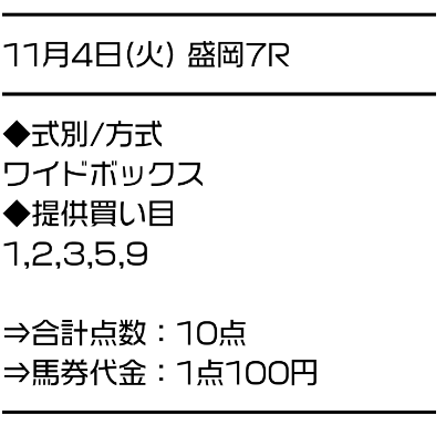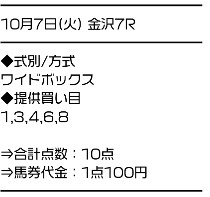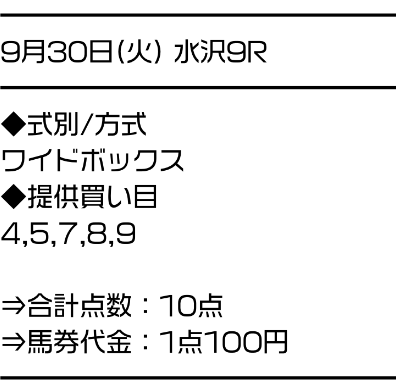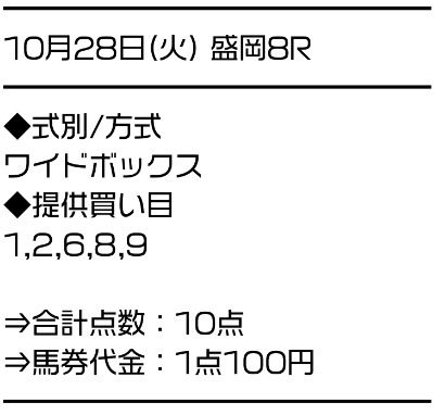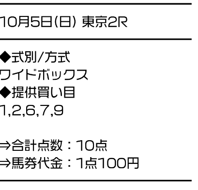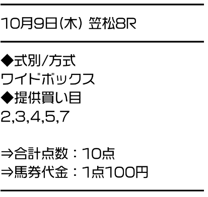 | 推奨馬券代 | 1レース10点/1点100円 |
