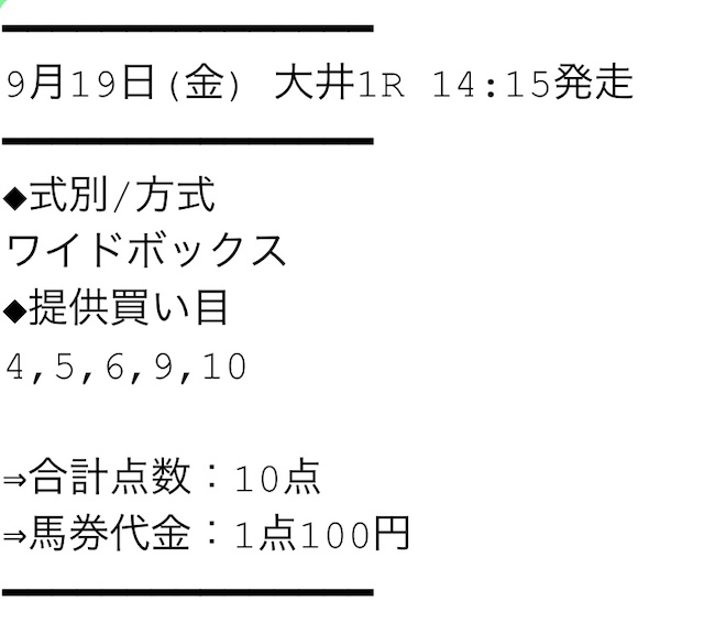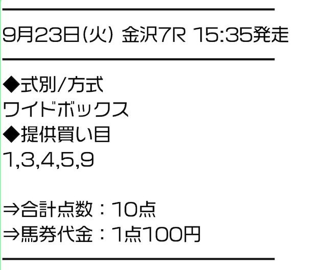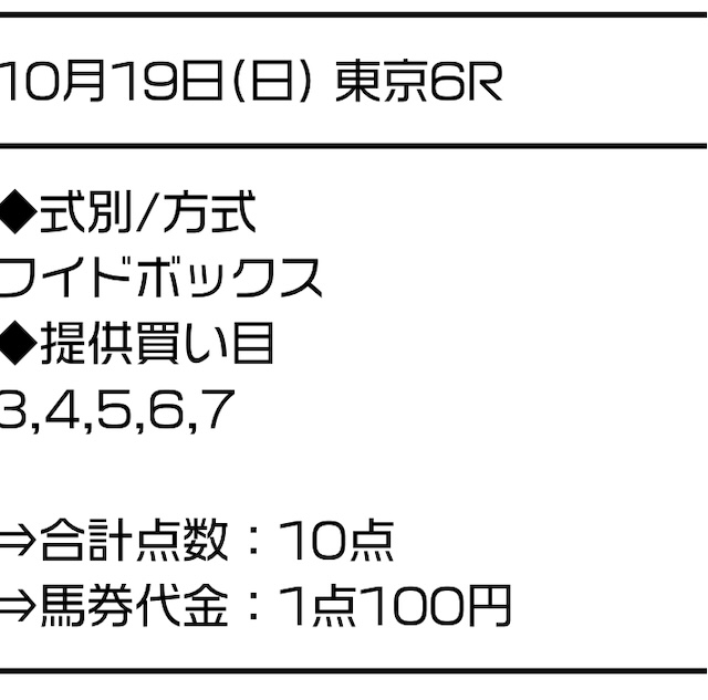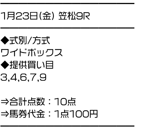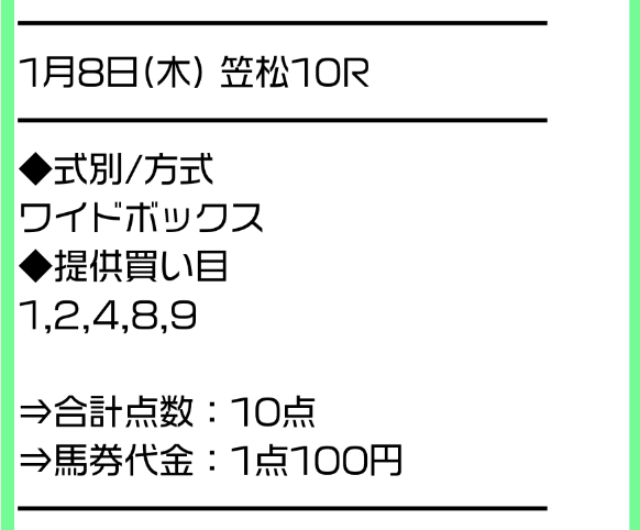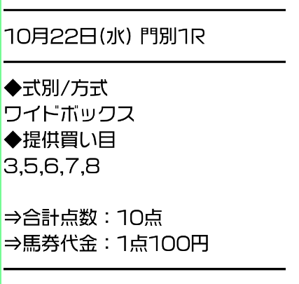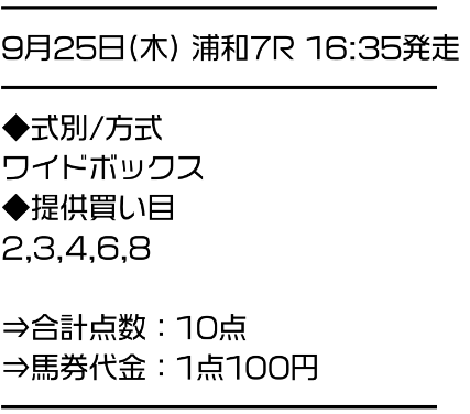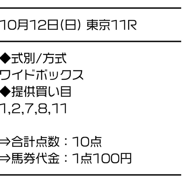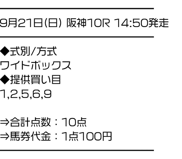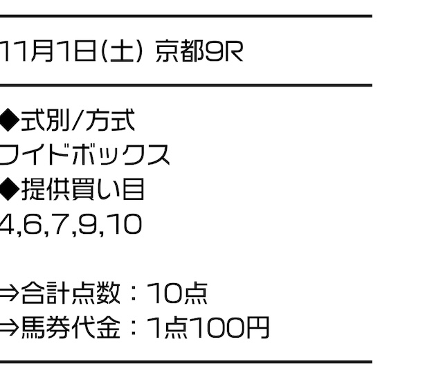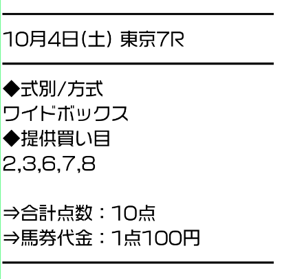 | 推奨馬券代 | 1レース10点/1点100円 |
