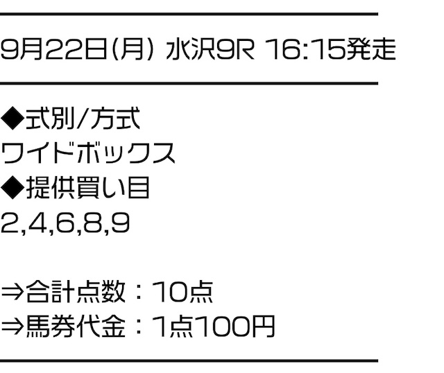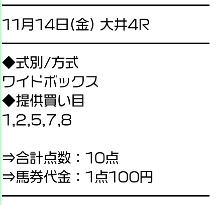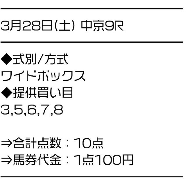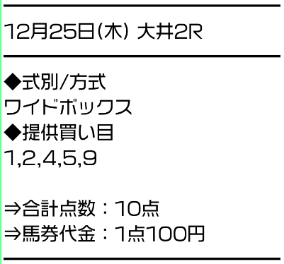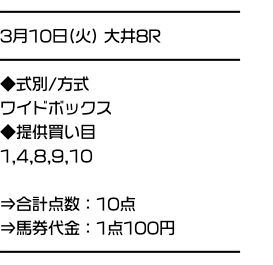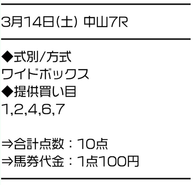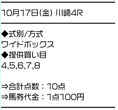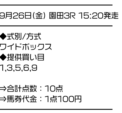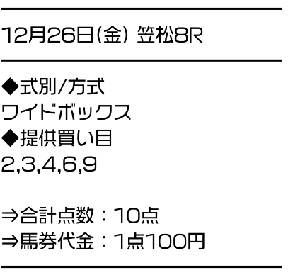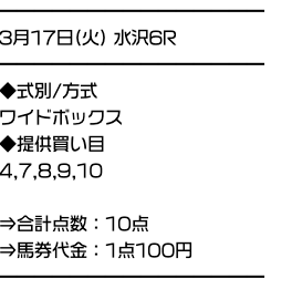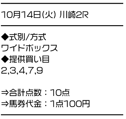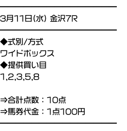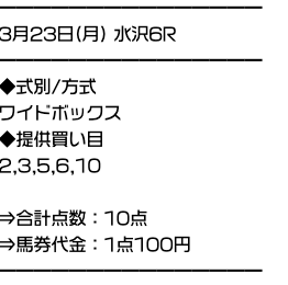| 血統の暗号 | 64,800円 | 土日4鞍/3連単 (1鞍5,000円以内) |