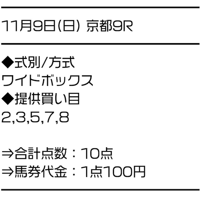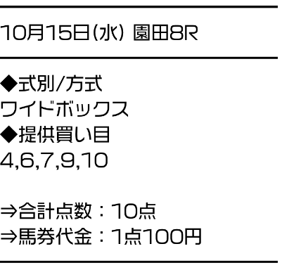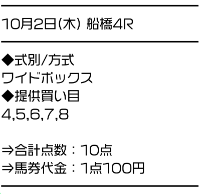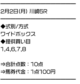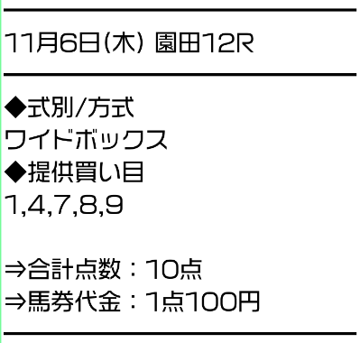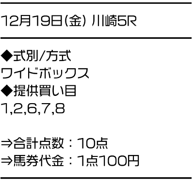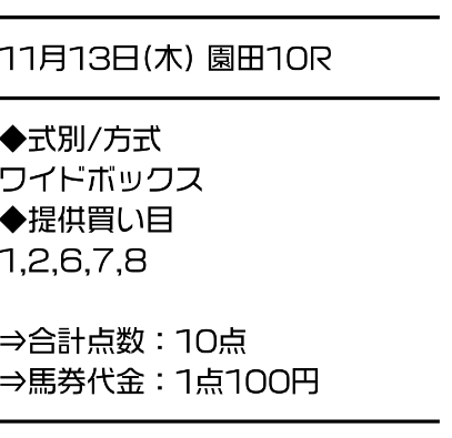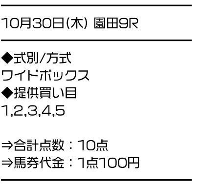 ワイド5頭BOXで的中を連発。激走する人気薄を見逃さないため、高配当も期待できる。 |