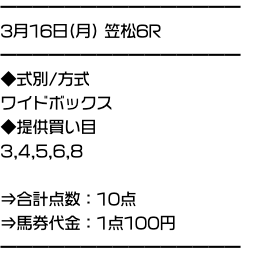 | 2026/3/23 | 水沢6R | ◯/11,700円 | ◯/11,100円 | -600円 |