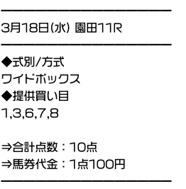 | 2026/3/18 | 園田11R | ◯/13,000円 | ◯/14,500円 | +1,500円 |