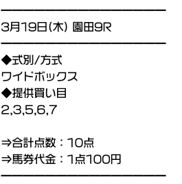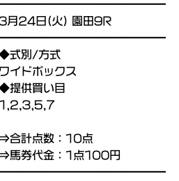 | 2026/3/19 | 園田9R | ◯/14,400円 | ◯/16,700円 | +2,300円 |