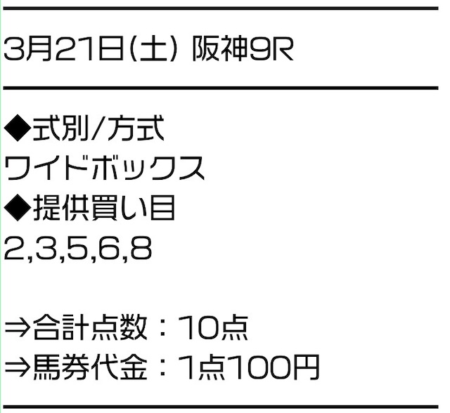 | 2026/3/21 | 阪神9R | ◯/12,700円 | ◯/16,200円 | +3,500円 |