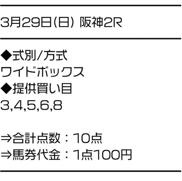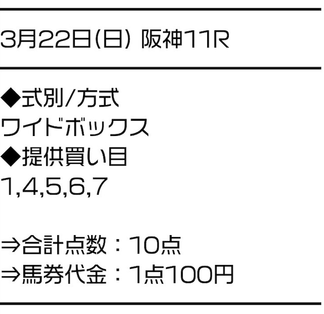 | 2026/3/22 | 阪神11R | ◯/13,900円 | ◯/15,400円 | +1,500円 |