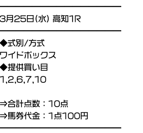 | 2026/3/25 | 高知1R | ◯/12,700円 | ◯/11,100円 | -1,600円 |