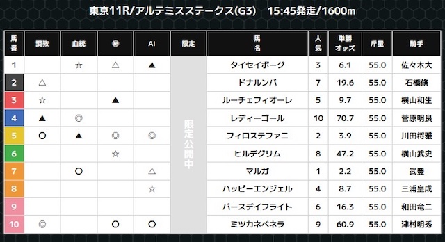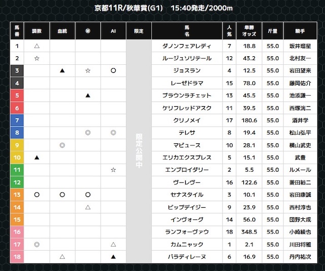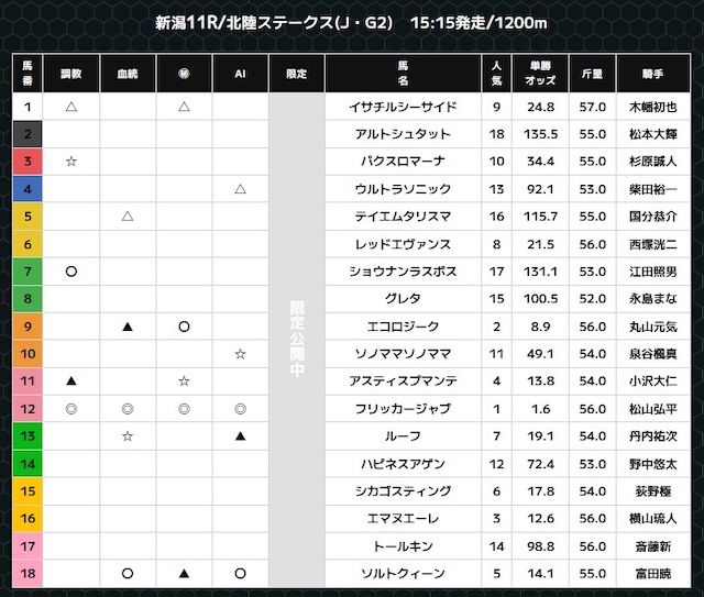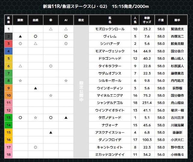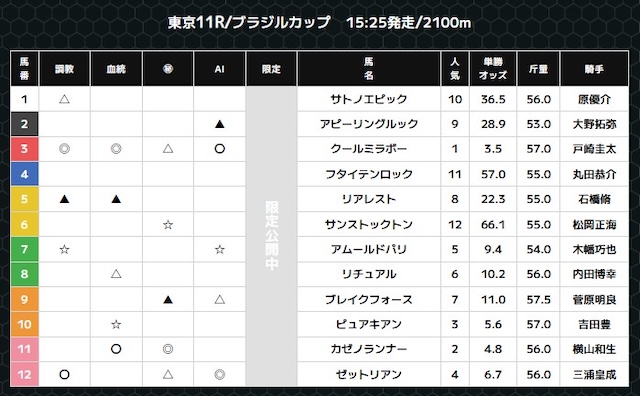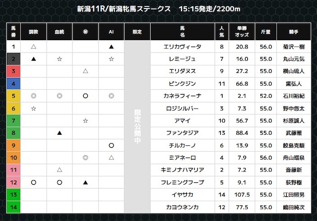 印の多さから推測するに、5番レイナデアルシーラの評価が最も高いようです。