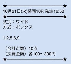 | 推奨馬券代 | 1点100円 1レース1,000円前後 |