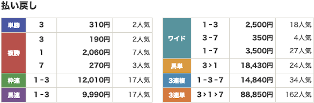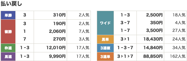 軸は3,9番人気の2頭で、相手には穴馬と人気馬をバランス良く選出していた。