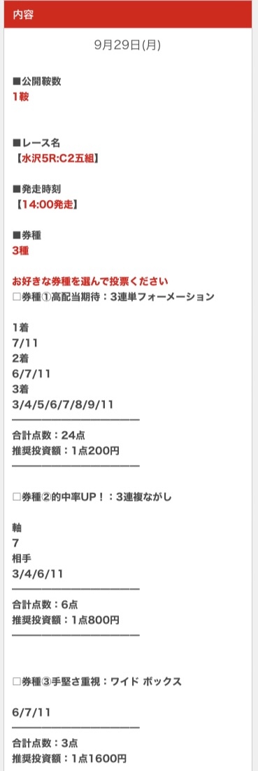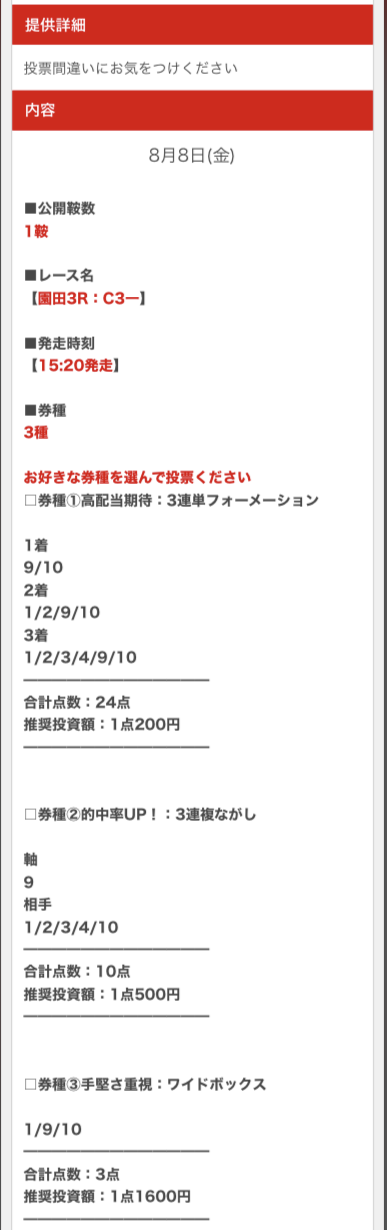 その他、公開する予想の情報元や買い目に関する事は一切書かれていませんでした。