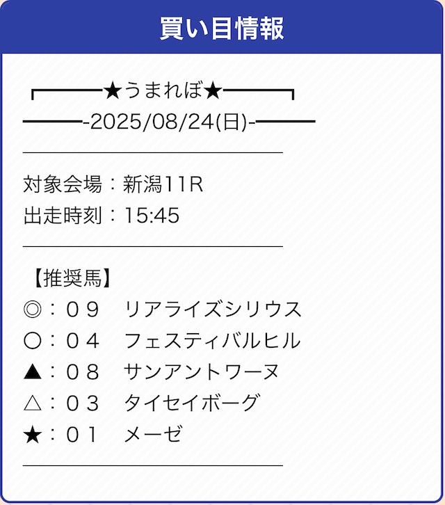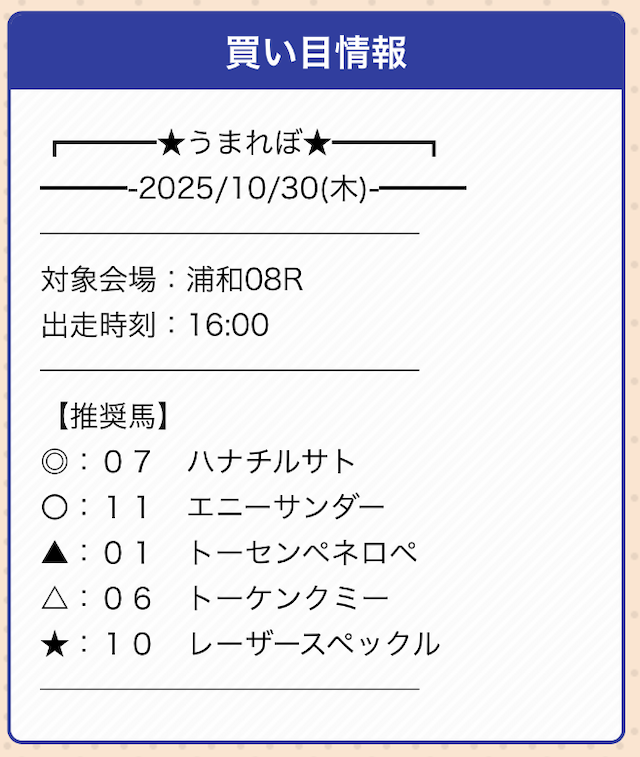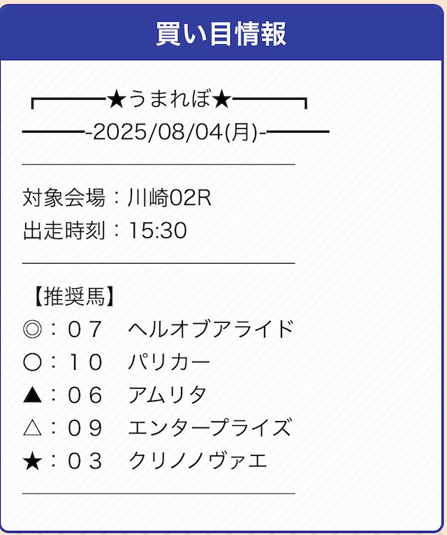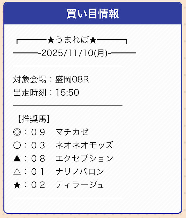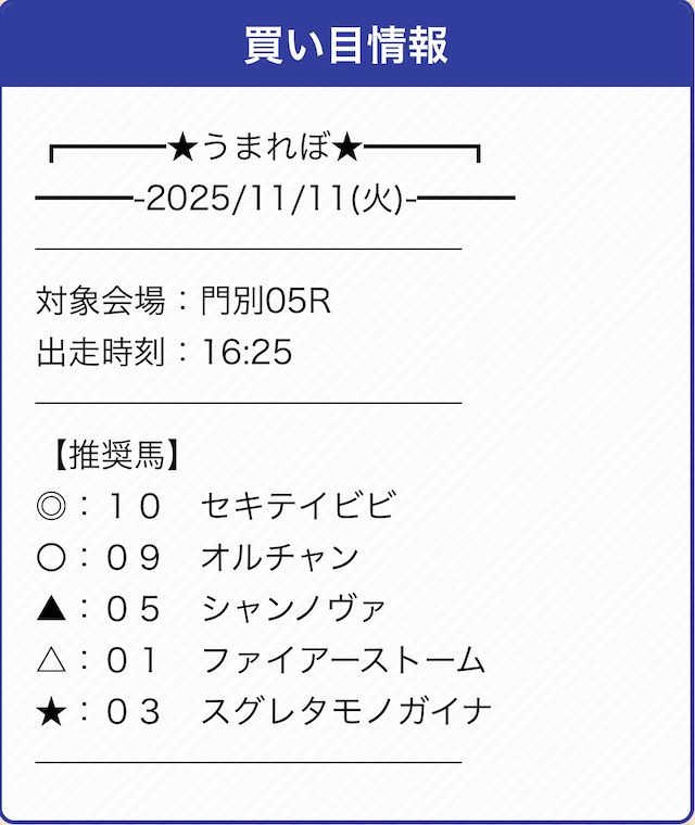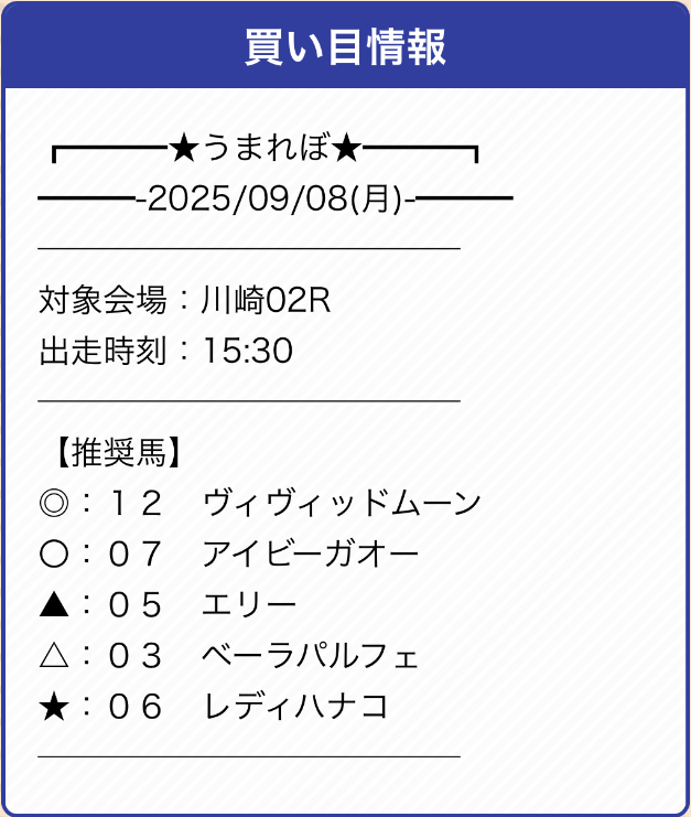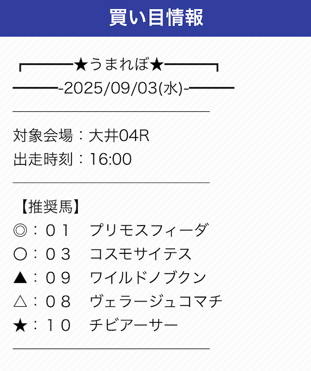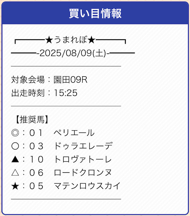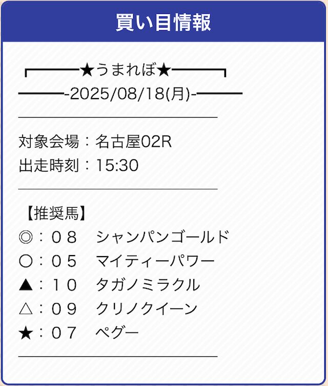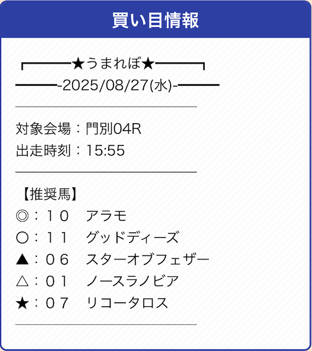 一方のうまれぼは予想印で公開されているので、指定されているのは馬のみ。
