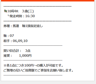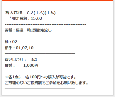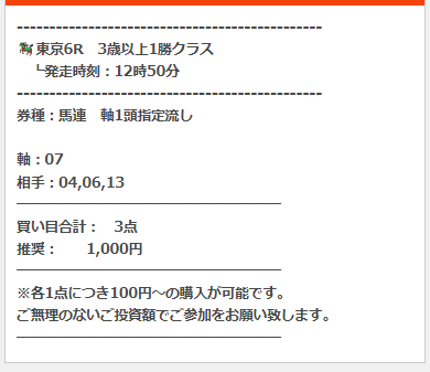 | プラン名 | 情報料金 | 公開数/券種 (馬券代) |